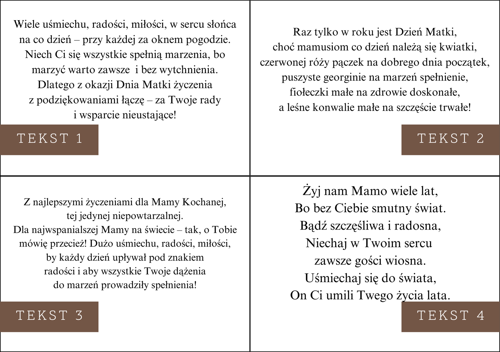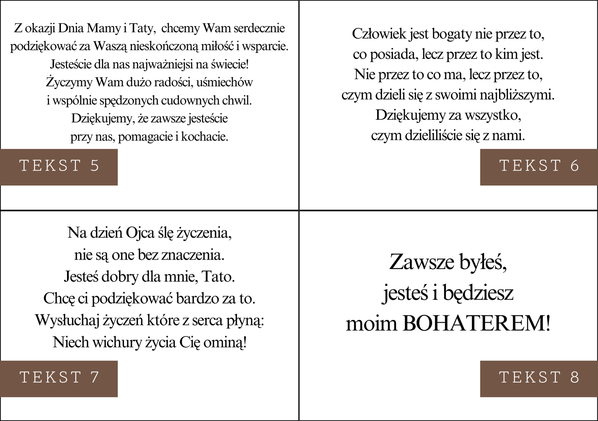 Do wyboru 8 wzory życzeń. Jeśli chcesz umieścić swoje indywidualne życzenia - napisz treść w uwagach do zamówienia.