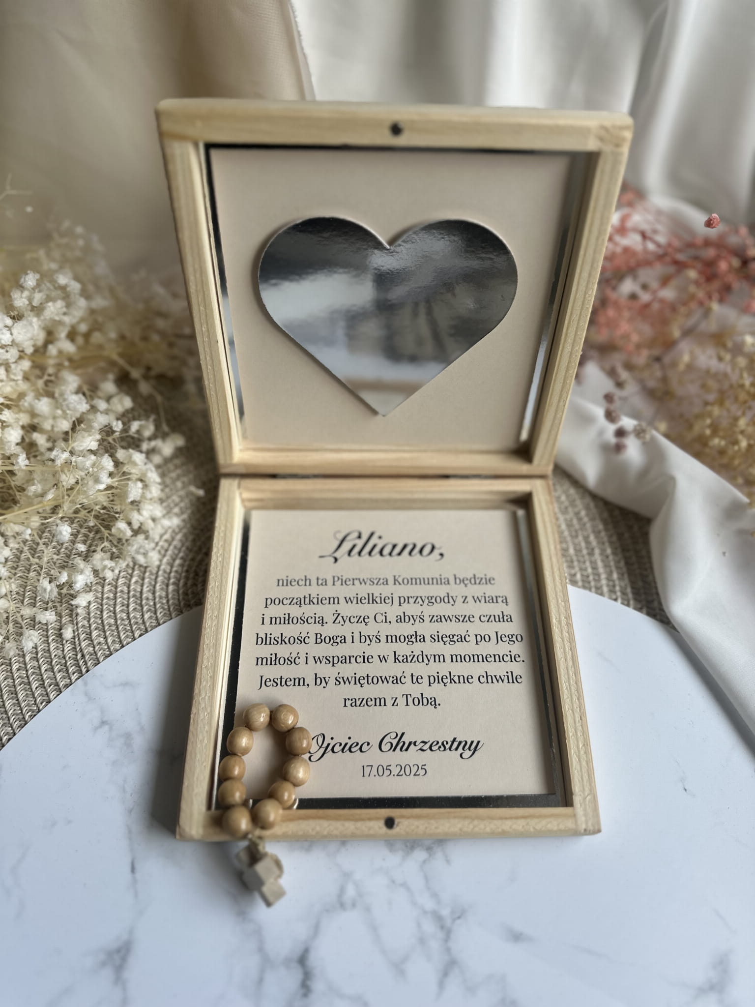 - możliwość dokupienia dodatkowo drewnianego różańca lub aniołka ze sznurka