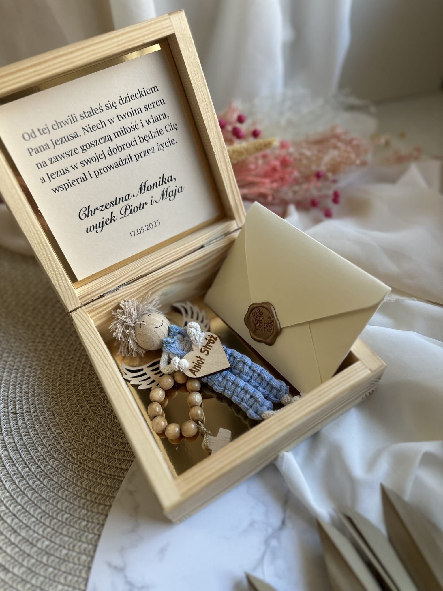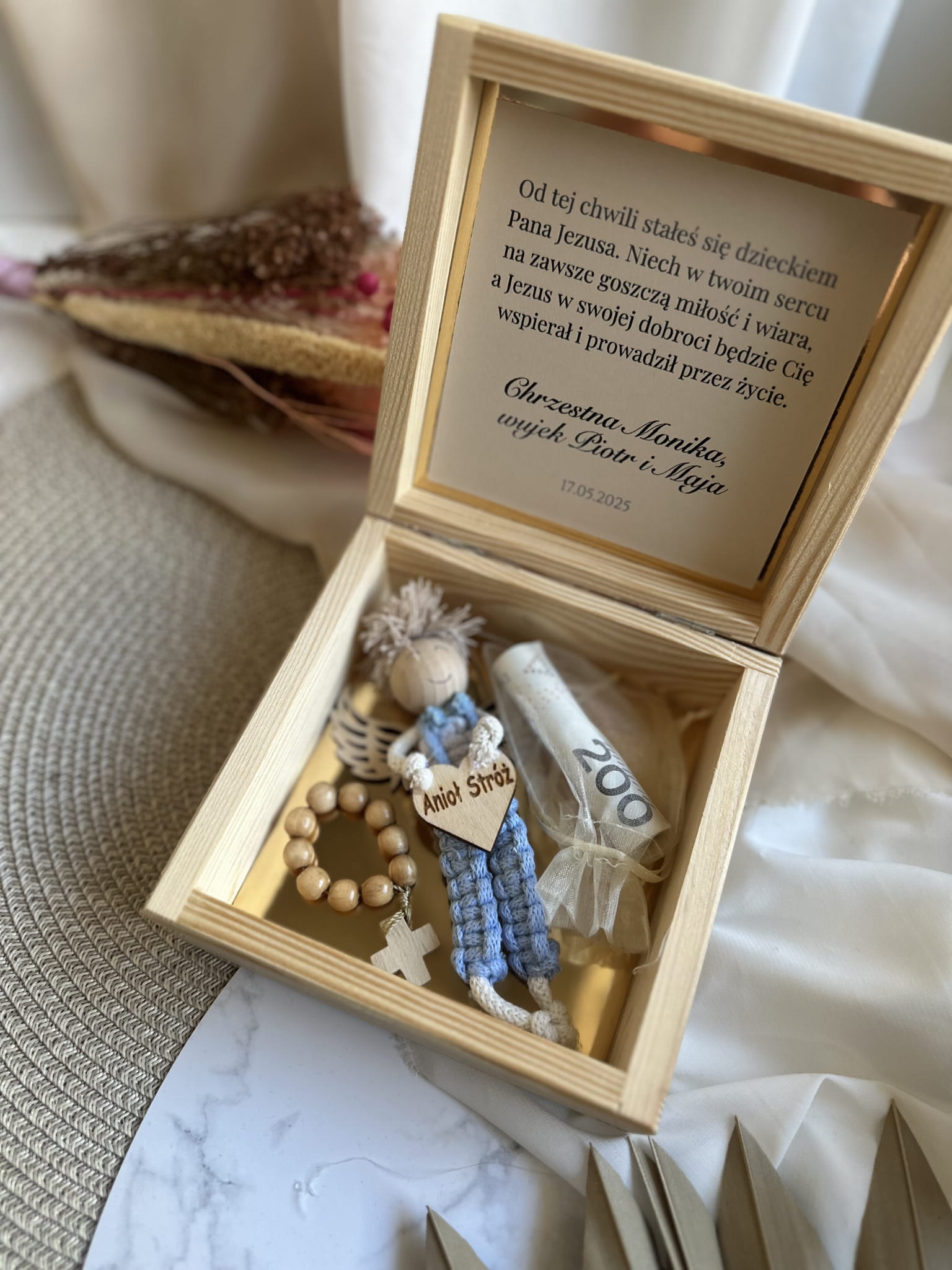 Drewniane pudełko jest idealnym sposobem na wręczenie pieniędzy z okazji Pierwszej Komunii Świętej. Stanowi alternatywę dla zwykłej kartki komunijnej. Jest to idealna pamiątka na tak ważne wydarzenie jakim jest przyjęcie Pierwszej Komunii Świętej, która pozostanie z dzieckiem przez długie lata.