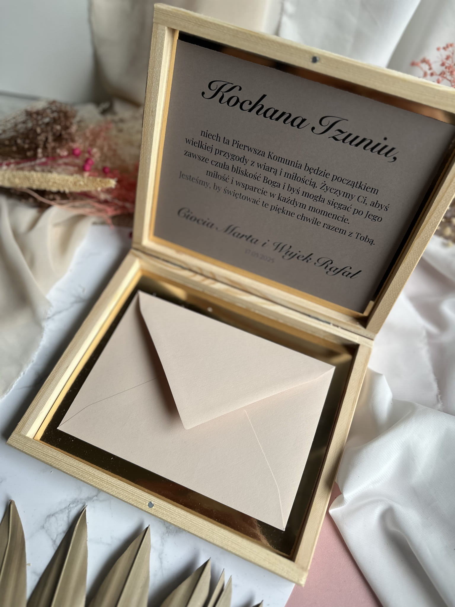 Drewniane pudełko jest idealnym sposobem na wręczenie pieniędzy z okazji Pierwszej Komunii Świętej. Stanowi alternatywę dla zwykłej kartki komunijnej. Na wieczku umieszczone jest imię dziecka wraz z datą uroczystości, całość wspaniale komponuje się z wybraną grafiką, Prezent komunijny dodatkowo można wzbogacić o czekoladę. Jest to idealna pamiątka na tak ważne wydarzenie jakim jest przyjęcie Pierwszej Komunii Świętej, która pozostanie z dzieckiem przez długie lata.