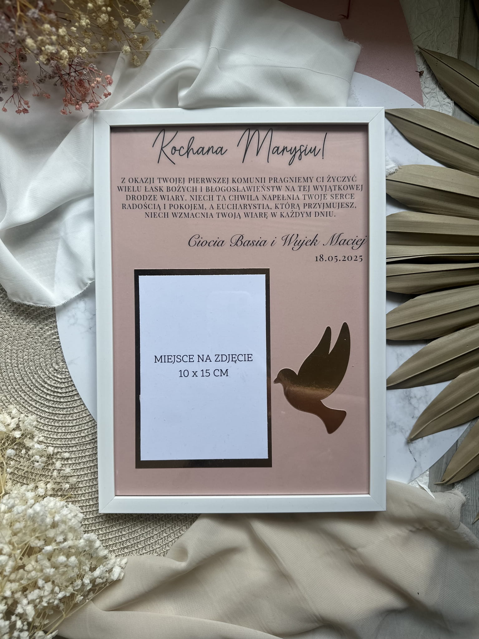 Ramka pamiątkowa w wymiarach A4, z miejscem na zdjęcie lub aniołka ze sznurka. Piękna pamiątka i jednocześnie dekoracja pokoju.