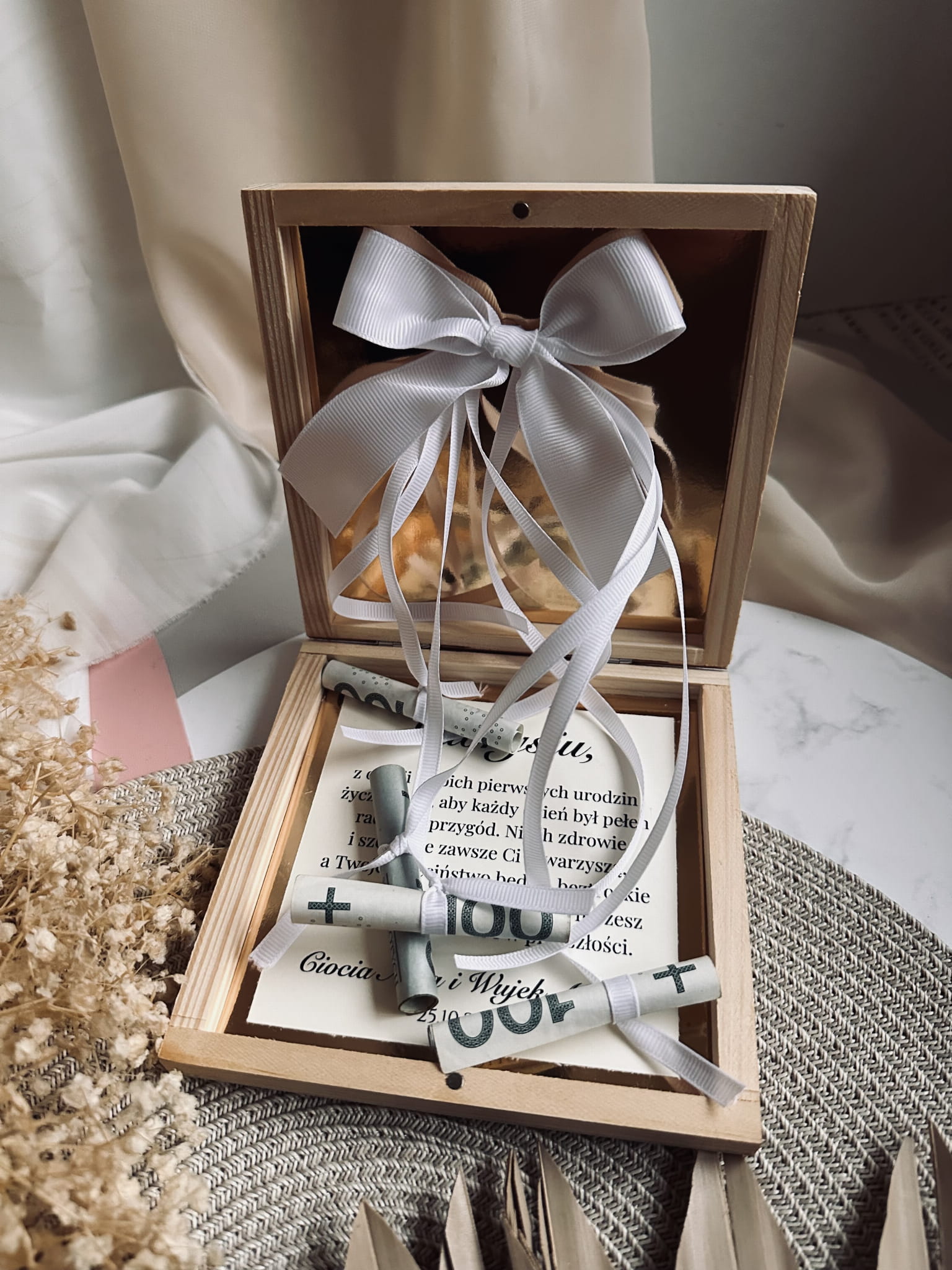 Wykonane z naturalnego drewna, ozdobione efektowną kokardą oraz personalizowaną dedykacją sprawi, że prezent nabierze wyjątkowego charakteru. W środku znajduje się miejsce na zrolowane banknoty lub inne drobiazgi — całość tworzy piękną, estetyczną i przemyślaną formę.