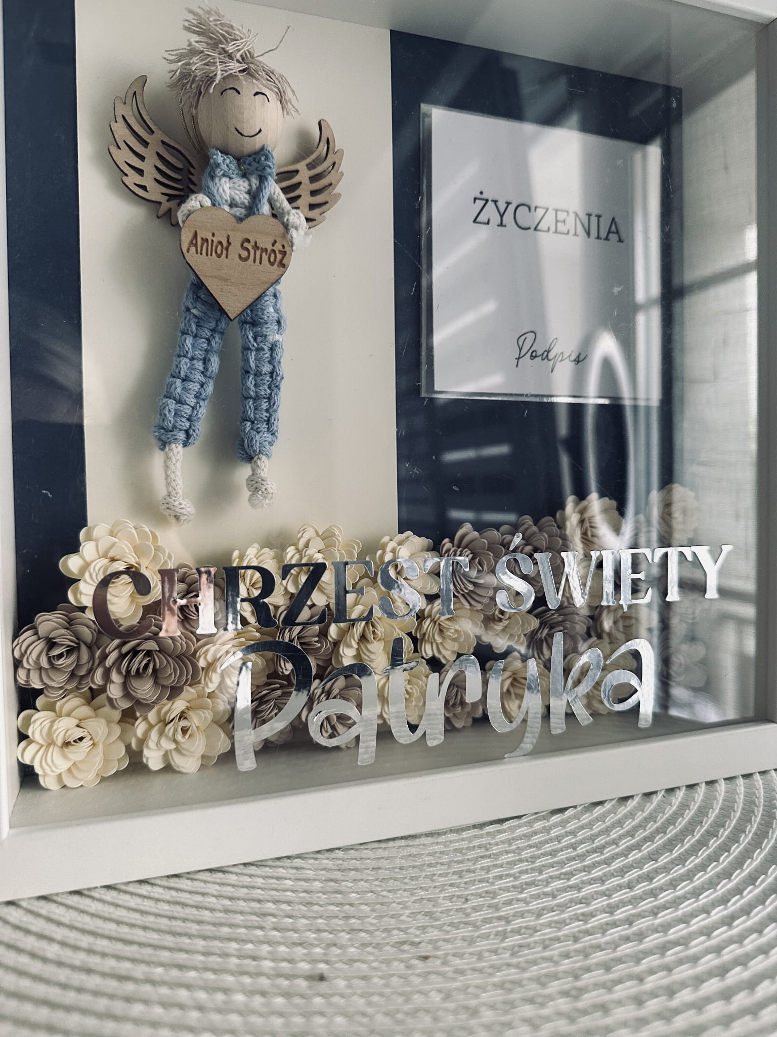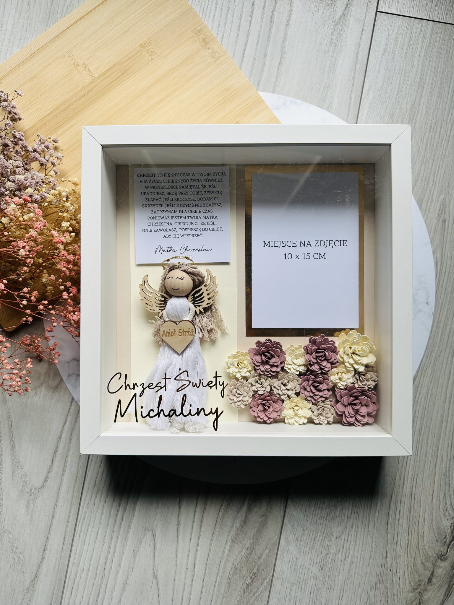 Personalizowana pamiątka z ręcznie robionymi kwiatami z efektem 3D.