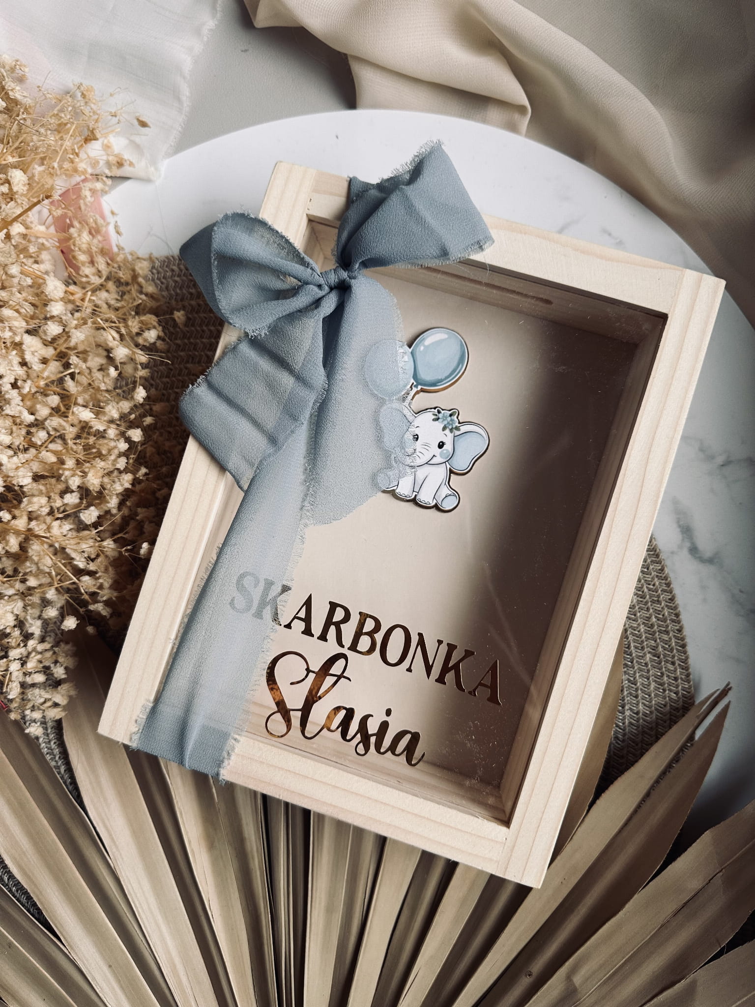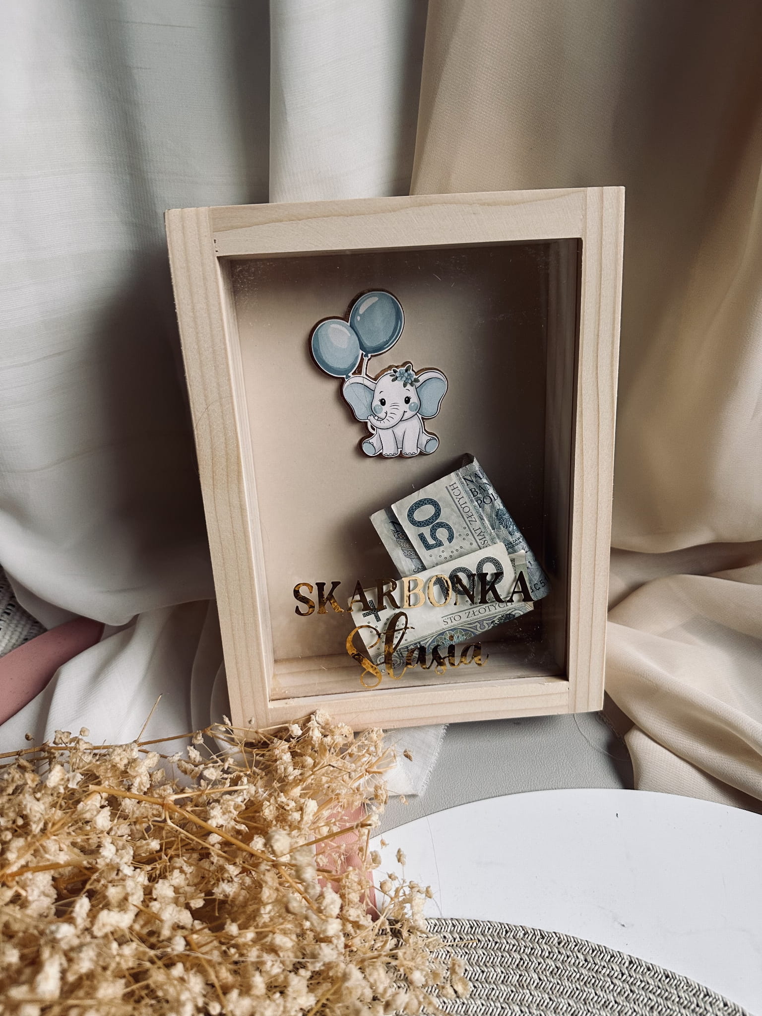Wyjątkowa skarbonka z imieniem, która będzie pięknym i praktycznym prezentem na narodziny, chrzest, urodziny lub inne ważne okazje. Wykonana z naturalnego drewna i zamknięta szklaną szybą, dzięki której widać rosnące oszczędności maluszka.