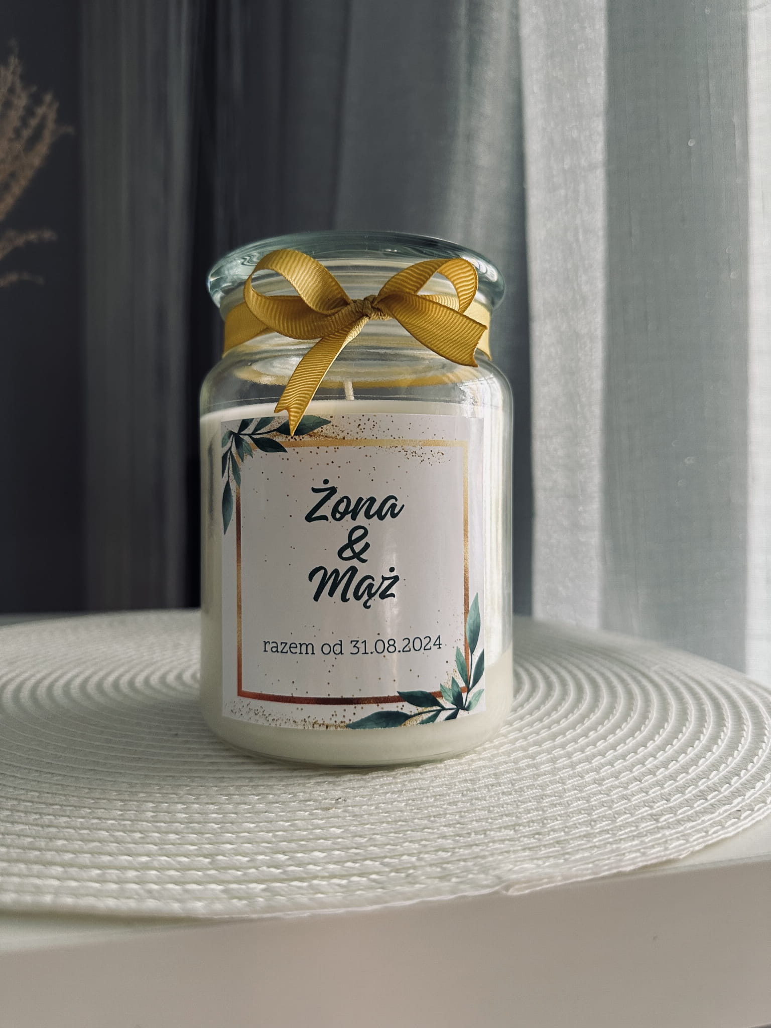 Świeczka z personalizowaną naklejką z datą ślubu Państwa Młodych. Wyjątkowy upominek, który będzie świetnym elementem dekoracyjnym domu oraz pamiątką.