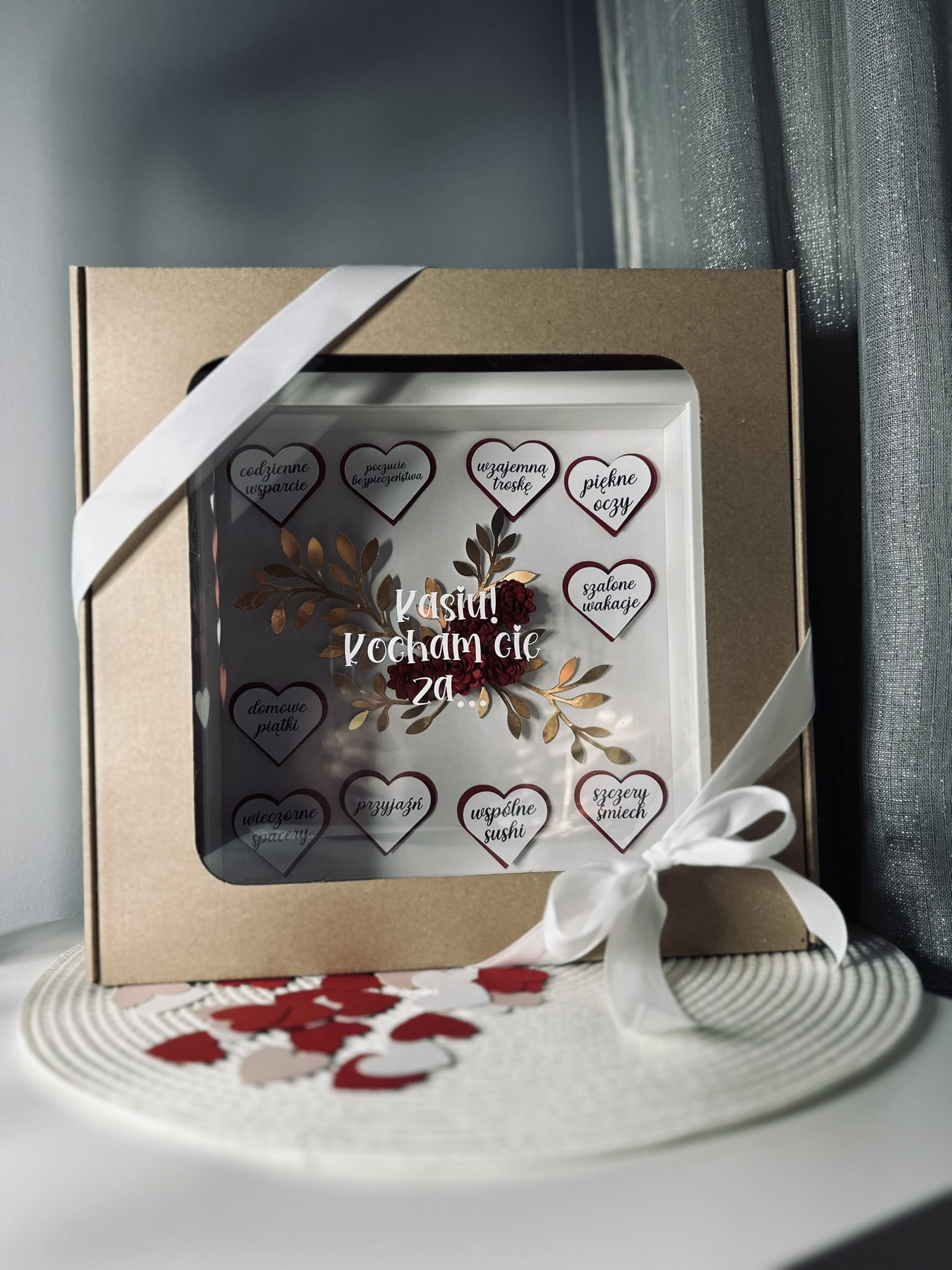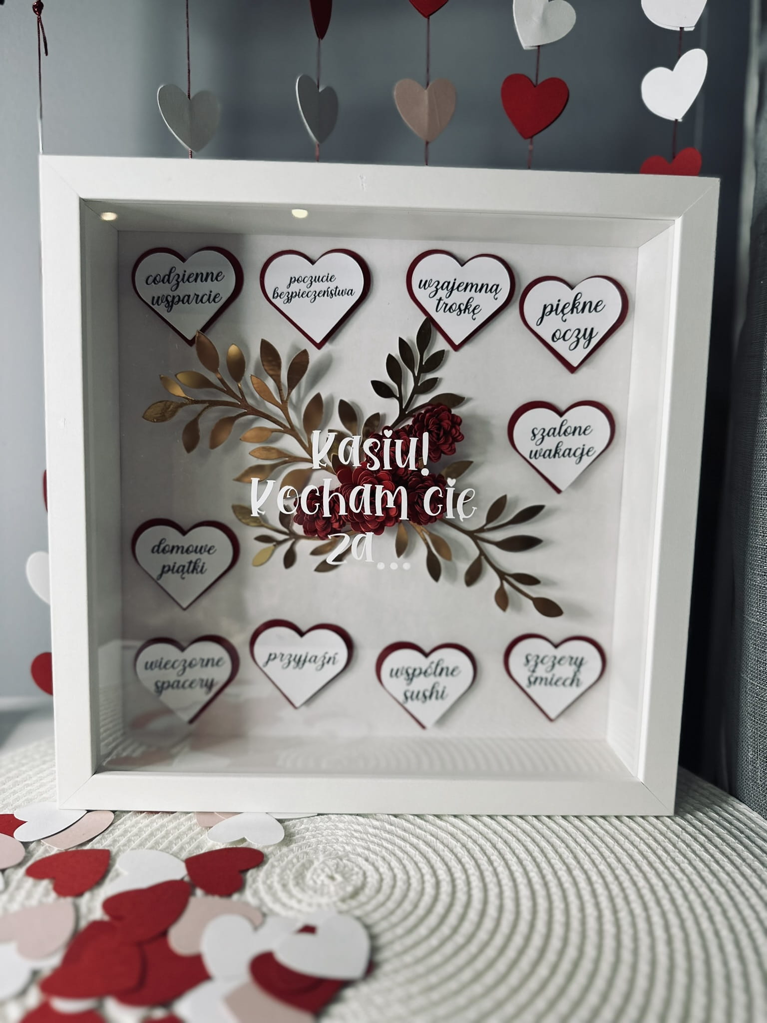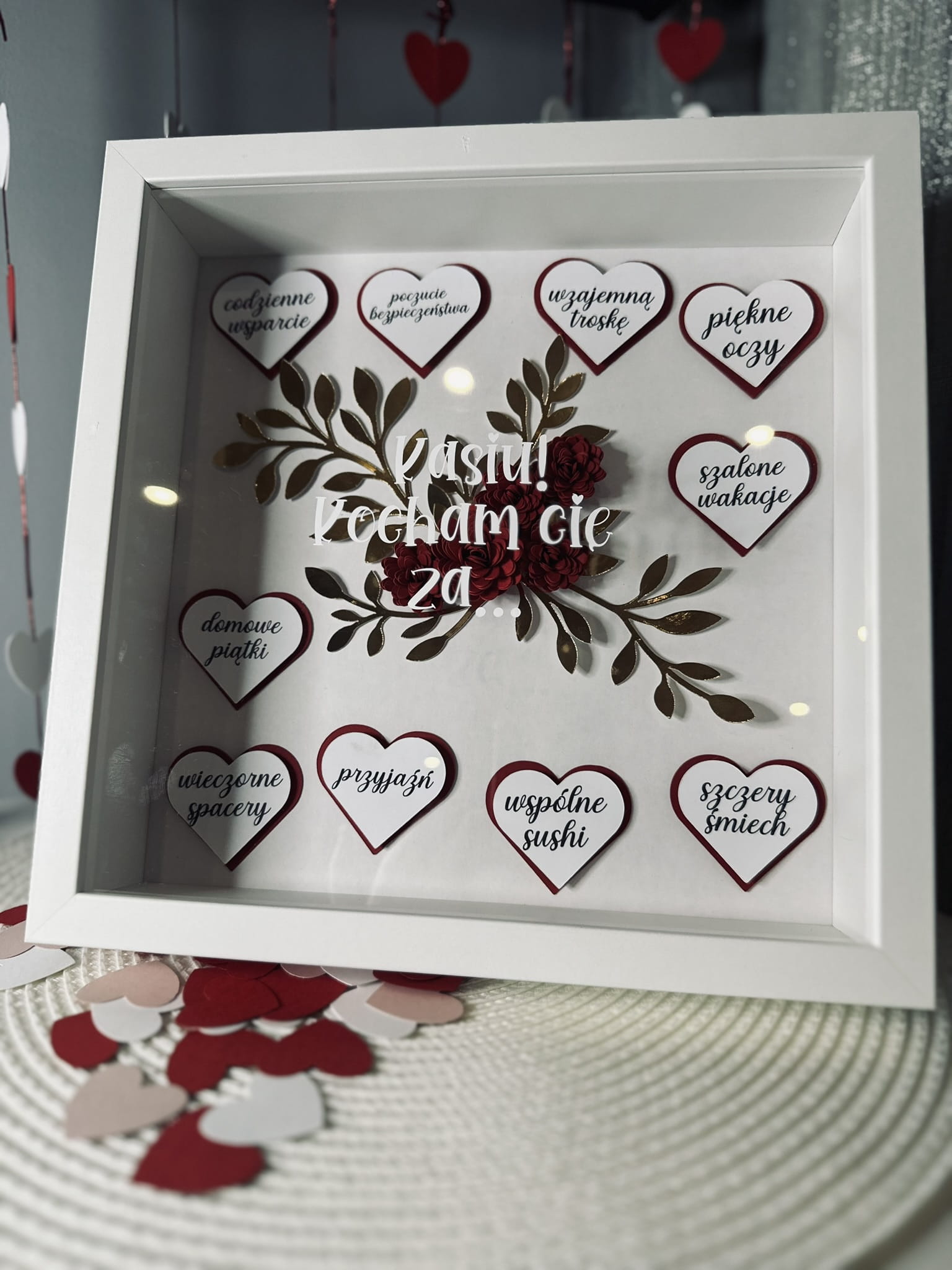 Personalizowana pamiątka walentynkowa z ręcznie robionymi kwiatami z efektem 3D i serduszkami z 10 powodami "za co kochamy" naszą drugą połówkę.